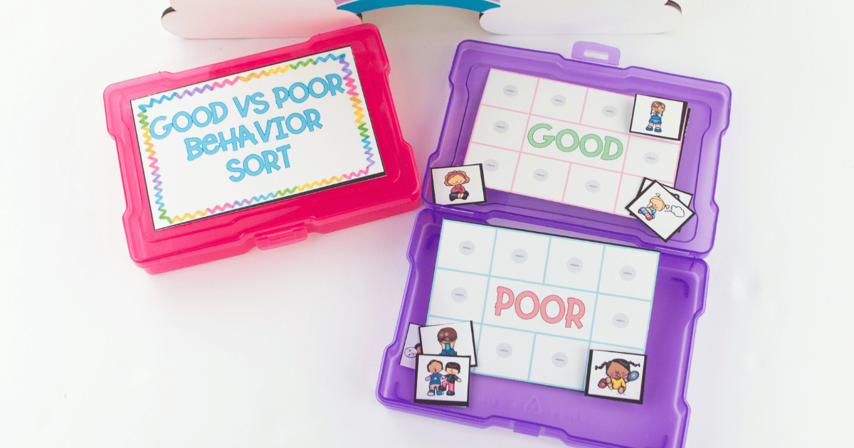 5. Student will identify between good and poor behavior in school in 8 out of 10 trials. This task box set has this exact goal inside.