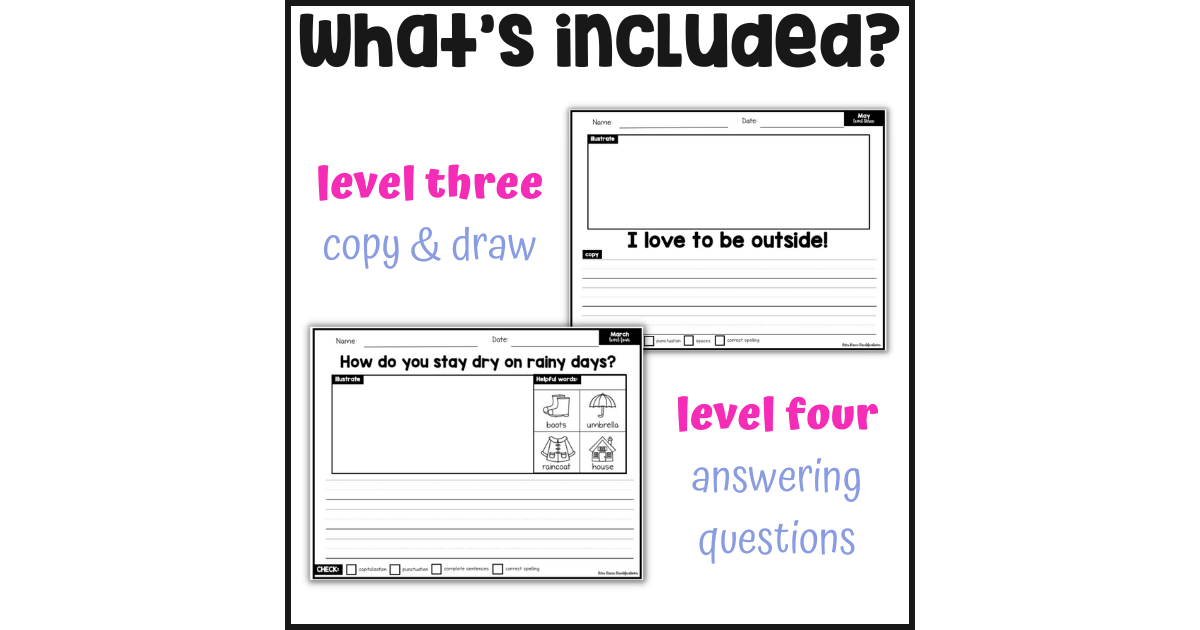 These monthly writing prompts are designed with differentiation in mind, ensuring that every student, regardless of their skill level, can have different ways to show you what they know. Let’s break down the four levels included in this digital download: